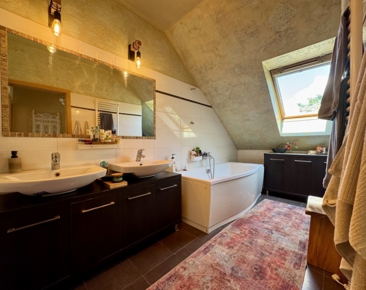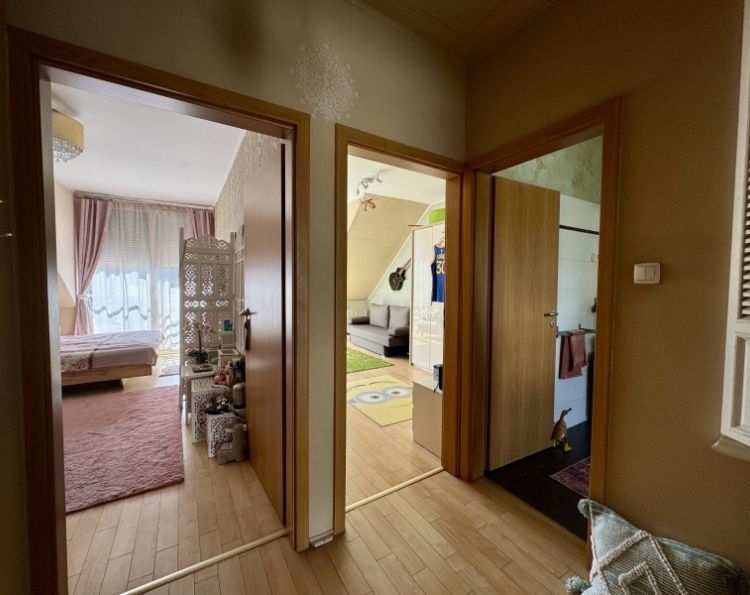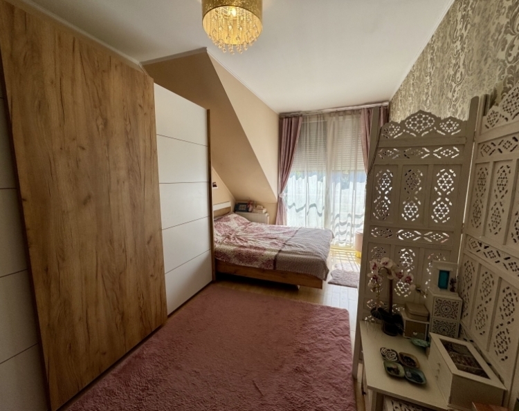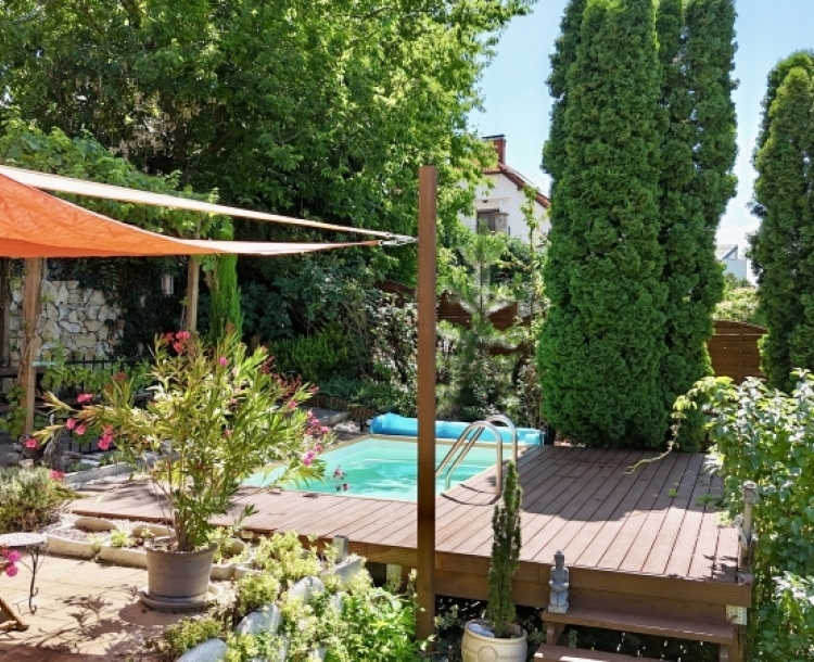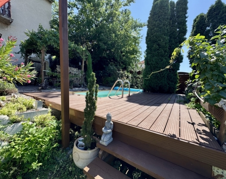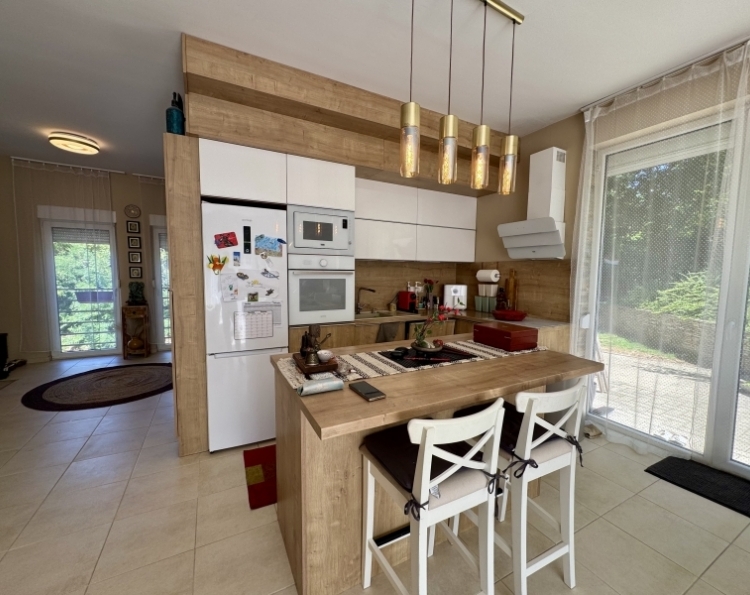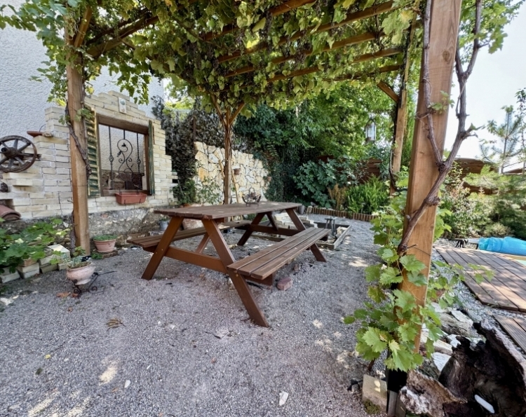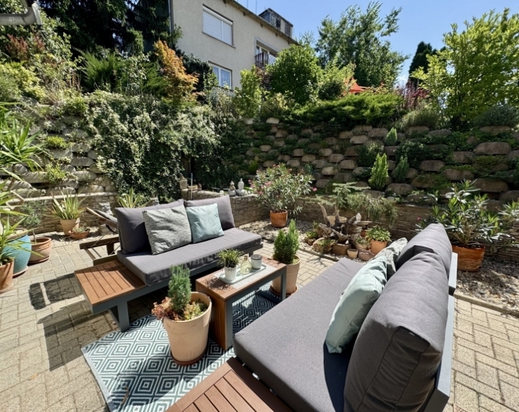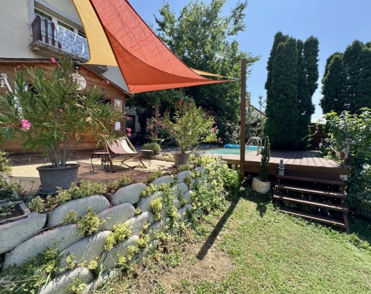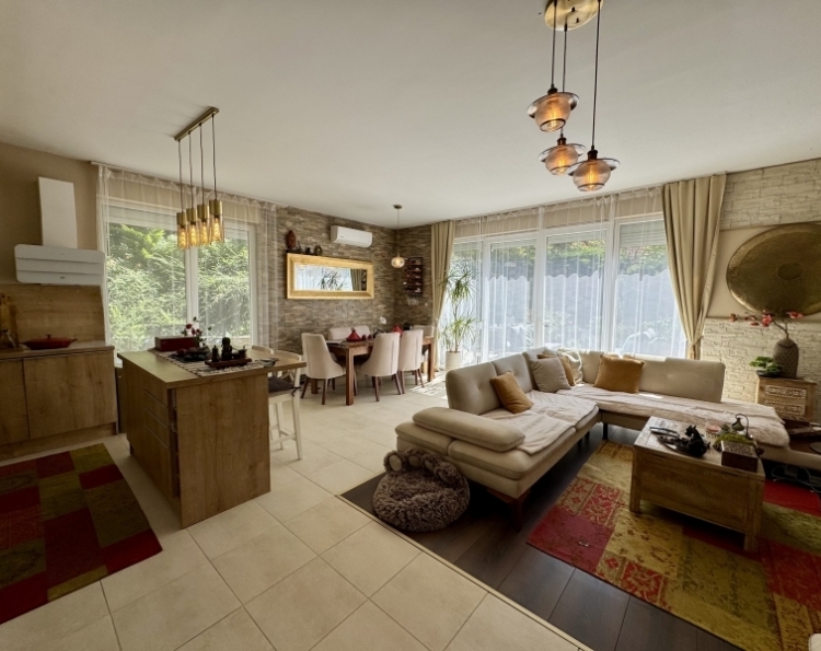 Pécs Mecsekoldal-Rigóderi részén különleges adottságokkal rendelkező kertkapcsolatos lakás eladó ! A három lakásos társasház 2008-ban épült. A belső két szintes ingatlanhoz tartozik egy csodálatosan kialakított kert, ebből kettő teraszként és egy kerti rész,ahol pezsgőmotoros polipropilén medence, pari házikó,szőlővel befuttatott pergola, sütögető és étkező rész lett kialakítva. A kertben szebbnél szebb növényekkel van beültetve,igazi mediterrán hangulatot teremtve. A kerti részről csodás Mecseki panorámában gyönyörködhet az új tulajdonos. Az alsó szint a teremgarázs szintje,ahol még egy saját tároló is tartozik az ingatlanhoz.Itt kapott helyet a gáz cirko kazán amihez egy vízlágyító is hozzá lett kötve. A lakásba érve egy tágas egy légtérben lévő előszoba-nappali-konyha étkező lett kialakítva. Három oldalról ablakokkal, ennek köszönhetően gyönyörű napfényes és tágas . A különleges nyugalmat árasztó déli terasz kerti csobogóval, virágokkal. Az alsó szinten még egy wc-mosdó is ki lett alakítva. Az emeleti szinten kádas fürdőszoba dupla mosdó,wc-bidé, itt kapott helyet a mosógép is.Két nagy méretű szoba is az emeleti szinten található. Minden szoba klimatizált. A hálószobák radiátorral fűtöttek,a többi helyiségben padlófűtés található. A nyílászárók elektromos redőnnyel szereltek. Az elektromos nyitóval ellátott gépkocsibeálló ára +5.9 millió forint. Egy igazi gyöngyszem az eladó ingatlanok kínálatában. Jöjjön tekintse meg és tegyen egy ajánlatot !