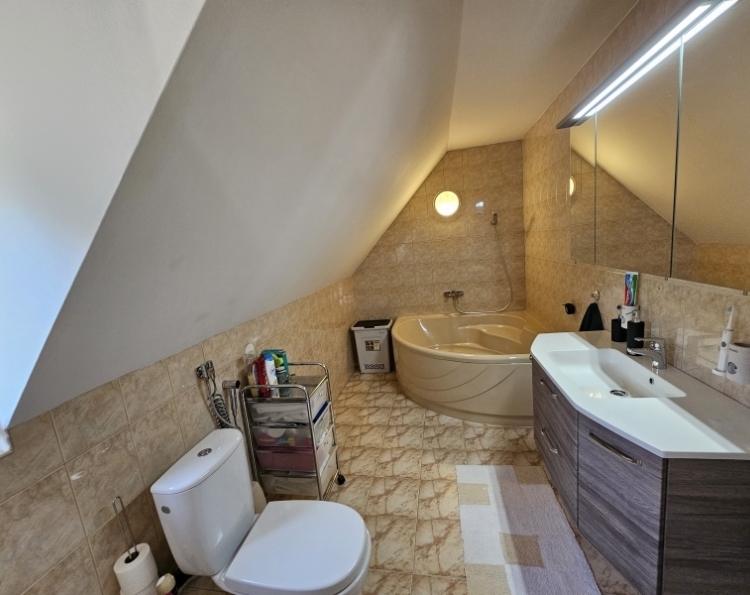 Eladó 2 szintes családi ház Pogányban – napelemmel, vállalkozásra is alkalmas garázzsal! Pécstől mindössze 8 km-re, Pogány csendes, nyugodt részén eladó egy kiváló állapotú, háromszintes, szigetelt családi ház, mely egy 1000 m²-es parkosított telken helyezkedik el. Főbb jellemzők: Lakótér: Alsó szint 120 m², felső szint 80 m², szuterén 120 m² Szobák: 3 külön nyíló szoba + nappali, téli kert, tágas konyha-étkező, előszoba Fürdőszobák: 2 fürdő, 2 WC Fedett, nagyméretű terasz Fűtés-hűtés: 6 db klíma, vegyes tüzelés és gázfűtés opció Ariston Lydos Hybrid bojler a melegvízhez BWT vízlágyító rendszer Nyílászárók: Műanyag ablakok sötétített üveggel ,redőnnyel, szúnyoghálóval Padlóburkolat: Szobák és nappali parkettás a többi helyiség járólappal burkolt Elektromos hálózat: 220V, 380V, 3x25A Biztonság: Riasztó, kamera rendszer, füstérzékelők Energiahatékonyság – teljesen rezsimentes! 10 kW-os E.ON által szerelt LG napelem rendszer (30 db panel, éves termelés: 13.680 – 14.000 kWh) A ház éves energiaigényét teljes egészében fedezi! Külső és egyéb extrák: 2 garázs (egyik szerelőaknával, vállalkozásra is alkalmas) Elektromos, kétszárnyú kapu Szépen térkövezett udvar, gondozott kert Filagória, szalonnasütő, grillező 8 m³-es esővízgyűjtő rendszer a locsoláshoz Tágas szuterén – ideális tárolásra, műhelynek, edzőteremnek is Egyéb információk: A bútorzat egy része megbeszélés tárgyát képezi A napelemrendszer garanciális Kizárólag komoly érdeklődők jelentkezését várjuk!