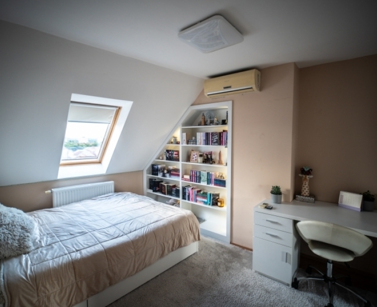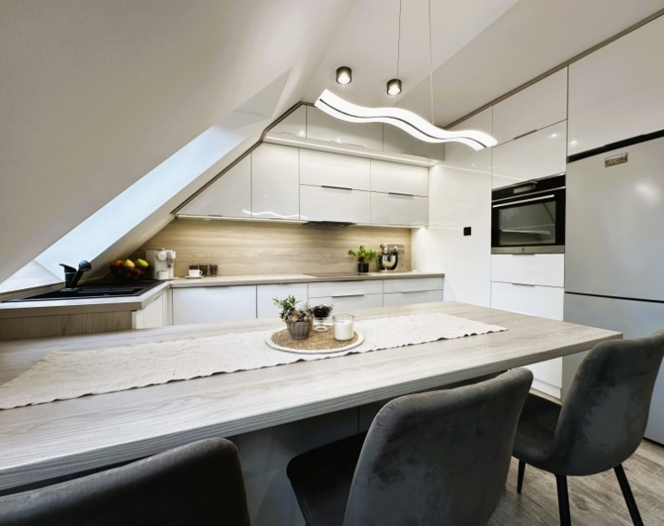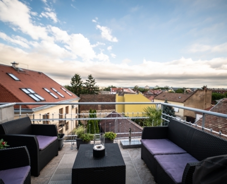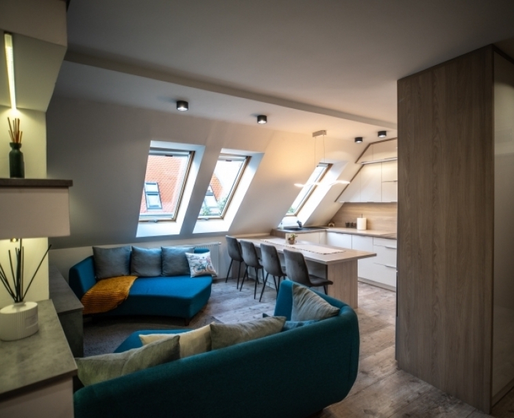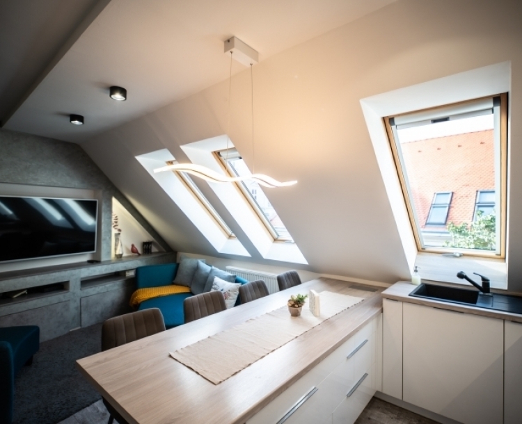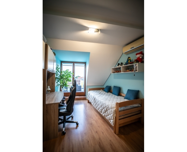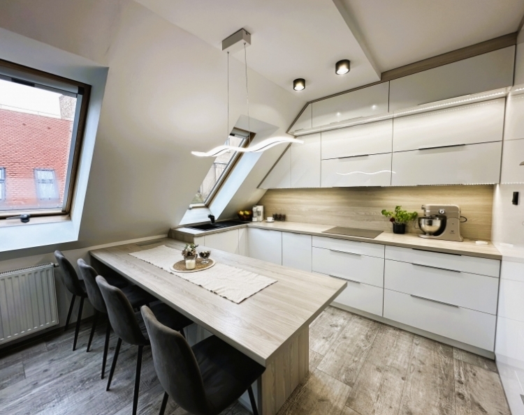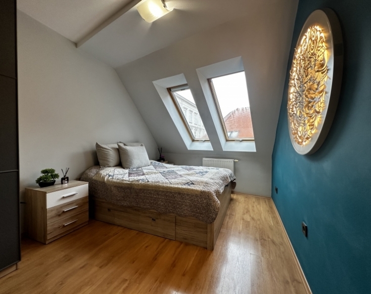 Eladó Pécs Egyetemvárosának egyik legkedveltebb utcájában, az Alkotmány utcában, ez a 92 m²-es, két szintes, amerikai konyhás nappali + 3 szobás, teljesen felújított lakás, amely egyszerre modern, elegáns és otthonos. Már az első pillanatban érezni, hogy ez az ingatlan különleges: a tágas, napfényes terek, a ferde tetősík alatti ablakok, a minőségi burkolatok és a letisztult, skandináv dizájn együttesen teremtik meg a “kikapcsolódásra hívó, mégis inspiráló otthon” hangulatát. A nappali és a konyha közös tere az otthon központja: a modern, egyedi gyártású konyhabútor minden kényelmet biztosít, a prémium gépekkel és a természetes fa tónusokkal kombinálva. A tágas étkezőpult mellett könnyed beszélgetések, baráti vacsorák és családi reggelik is élménnyé válnak. A nappali világos, meghitt, mégis modern – tökéletes filmnézéshez vagy pihenéshez. Az alsó szinten található két hálószoba mindkettő tágas és csendes – az egyik közvetlenül teraszkapcsolatos, így a reggeli kávézás vagy az esti borozás a friss levegőn garantált élmény. Az emeletre egy stílusos lépcső vezet, ahol egy külön háló, fürdő és WC kapott helyet – teljesen szeparált, ideális a nyugalmat kereső szülőknek vagy vendégszobának. A lakás gázcirkó fűtésű, klímával is felszerelt, így minden évszakban kellemes hőmérséklet biztosított. A belső terek vezeték- és nyílászárócserén estek át, új burkolatokkal, rejtett LED világítással és minőségi anyagokkal megvalósított dizájnnal. A lakás egy rendezett, csendes, parkos környezetben található, miközben csupán 15 perc sétára a Széchenyi tértől – így egyszerre élvezheted a belváros pezsgését és a családi házas nyugalmat. Ez az ingatlan ideális választás: családoknak, akik modern, több szobás otthont keresnek kiváló elhelyezkedéssel, külföldi befektetőknek, akik hosszú távú, prémium bérbeadásban gondolkodnak, vagy bárkinek, aki nem kompromisszumot, hanem kész, tökéletes otthont keres Pécs legjobb részén.
