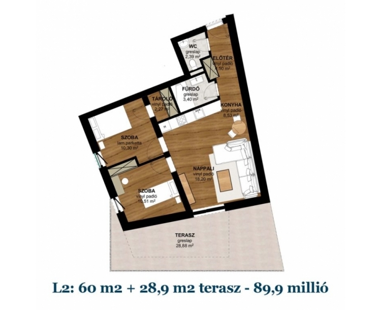 Újonnan épülő 10 lakásos társasházban eladó egy földszinti 60 m2-es két hálószobás lakás terasszal. Kiváló elrendezésű, minden helyiség külön nyílik. Elosztása: előszoba, fürdőszoba, WC+ kézmosó, nappali, konyha+ étkező, 2 külön nyíló szoba, melyek egyikéből nyílik egy tároló. A nappaliból és az egyik szobából léphetünk ki a 29 m2-es teraszra. Az előszoba, a tároló és a nappali+ konyha vinyl padló, a szobák laminált padló, a WC, a fürdőszoba és a terasz greslap burkolatot kap. Műszaki leírás: - 30-as porotherm téglából épül, 12 cm külső hőszigetelést kap az épület - nyílászárók középszürke színű fa, homlokzati nyílászárók kerülnek beépítésre, 3 rétegű hőszigetelő üvegezéssel. - központi fűtés, melyet fűtést-hűtést is biztosító hőszivattyú biztosít. Az alacsony hőmérsékleten működő hűtő – fűtő rendszer felületi hőleadással kerül kialakításra, padló-mennyezetfűtéssel nyáron mennyezet hűtéssel, mely helyiségenként szabályozható. A zárt udvarban parkolóhely vásárolható, mélygarázs 7M Ft, felszíni parkoló 4M Ft. Remek elhelyezkedésének köszönhetően pár perc séta a Jogi -és Közgazdaságtudományi egyetem, és a Király utca. 200 méteren belül elérhető orvosi rendelő, gyógyszertár, éttermek, boltok. Befektetésre is kiváló lehetőség. Várható átadás 2027.07.31. További kérdés esetén keressen bizalommal!