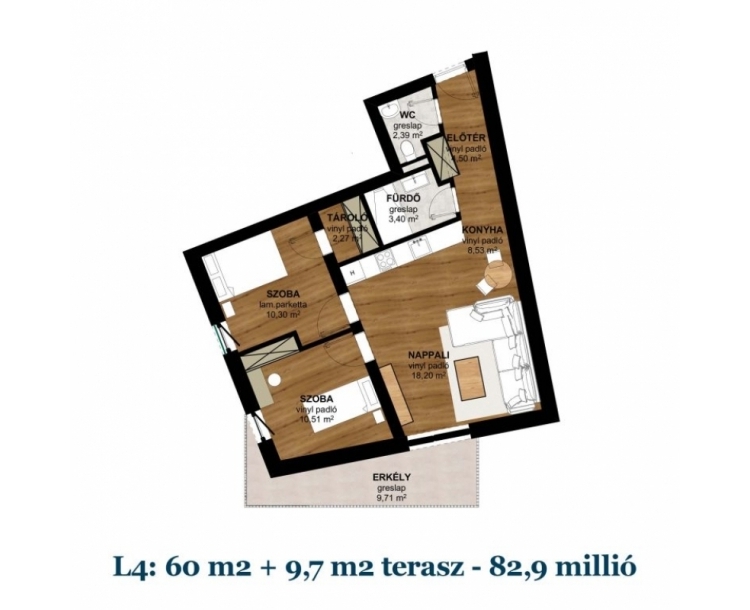 Újonnan épülő 10 lakásos társasházban eladó egy 1. emeleti 60 m2-es két hálószobás, erkélyes lakás. Kiváló elrendezésű, minden helyiség külön nyílik. Elosztása: előszoba, fürdőszoba, WC+ kézmosó, nappali, konyha+ étkező, 2 külön nyíló szoba, melyek egyikéből nyílik egy tároló. A nappaliból és az egyik szobából léphetünk ki a 9 m2-es teraszra. Az előszoba, a tároló és a nappali+ konyha vinyl padló, a többi helyiség és a terasz greslap burkolatot kap. Műszaki leírás: - 30-as porotherm téglából épül, 12 cm külső hőszigetelést kap az épület - nyílászárók középszürke színű fa, homlokzati nyílászárók kerülnek beépítésre, 3 rétegű hőszigetelő üvegezéssel. - központi fűtés, melyet fűtést-hűtést is biztosító hőszivattyú biztosít. Az alacsony hőmérsékleten működő hűtő – fűtő rendszer felületi hőleadással kerül kialakításra, padló-mennyezetfűtéssel nyáron mennyezet hűtéssel, mely helyiségenként szabályozható. A zárt udvarban parkolóhely vásárolható, mélygarázs 7M Ft, felszíni parkoló 4M Ft. Remek elhelyezkedésének köszönhetően pár perc séta a Jogi -és Közgazdaságtudományi egyetem, és a Király utca. 200 méteren belül elérhető orvosi rendelő, gyógyszertár, éttermek, boltok. Befektetésre is kiváló lehetőség. Várható átadás 2026.12.31. További kérdés esetén keressen bizalommal!