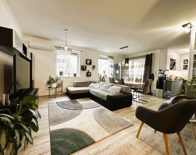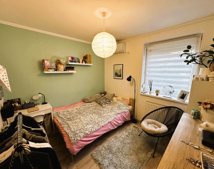 Pécs egyik legnépszerűbb városrészén, a Rigóderrel szemben, zárt lakóparkban kínálok eladásra egy társasház földszintjén található 70m2-es KERTKAPCSOLATOS lakást. A lakás elosztása kiváló. A hosszú, tágas előszobából nyílik 2 külön hálószoba, fürdőszoba WC-vel, egy amerikai konyhás nappali, majd egy 6m2-es terasz közvetlen kertkapcsolattal. A kert 60 m2, ahonnan gyönyörű panoráma nyílik a Mecsekre. Az ingatlan 2022-ben teljes körű belső felújításon esett át, mely magában foglalta: Belső nyílászárók cseréjét, fürdőszoba felújítását, burkolatok cseréjét, új modern konyhabútor beépítését. A konyhában minőségi beépített gépek találhatók. Fűtése házközponti rendszerű, továbbá a nappaliban és az egyik hálószobába hűtő-fűtő klíma biztosítja az egész éves komfortot. A lakópark csendes, rendezett, biztonságos környezetben helyezkedik el. A közelben elérhető élelmiszerbolt, iskola, tömegközlekedési eszközök. A lakásban található bútorzat és berendezés megegyezés tárgyát képezi! Ha egy modern, kertkapcsolatos, felújított lakást keresel Pécs egyik legkedveltebb részén, hívj bizalommal, és tekintsd meg személyesen!
